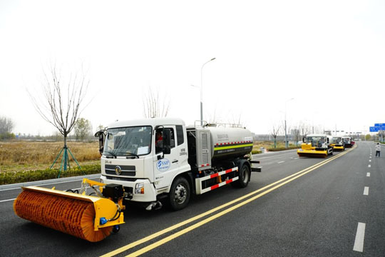 此次演練活動(dòng)在園區(qū)復(fù)旦路和紫金山路現(xiàn)場(chǎng)展開,模擬宿遷地區(qū)寒潮大雪天氣下的道路掃雪除冰應(yīng)急處置。隨著現(xiàn)場(chǎng)指揮一聲令下,演練正式拉開帷幕。所有人員及各類掃雪除冰設(shè)備迅速抵達(dá)指定位置,嚴(yán)格按照“雪前準(zhǔn)備、預(yù)警發(fā)布、應(yīng)急啟動(dòng)”的流程展開作業(yè)。演練以機(jī)械除雪為主,人工清理為輔,多臺(tái)撒布機(jī)、雪滾車、雪鏟車等專業(yè)設(shè)備輪番上陣,在模擬的冰雪場(chǎng)景中高效進(jìn)行清雪和除冰作業(yè),全面檢驗(yàn)了應(yīng)急預(yù)案的科學(xué)性和實(shí)操性。