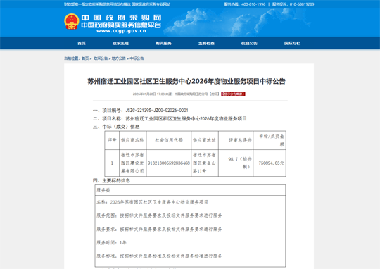 喜報(bào):建發(fā)公司中標(biāo)蘇州宿遷工業(yè)園區(qū)社區(qū)衛(wèi)生服務(wù)中心2026年度物業(yè)服務(wù)項(xiàng)目