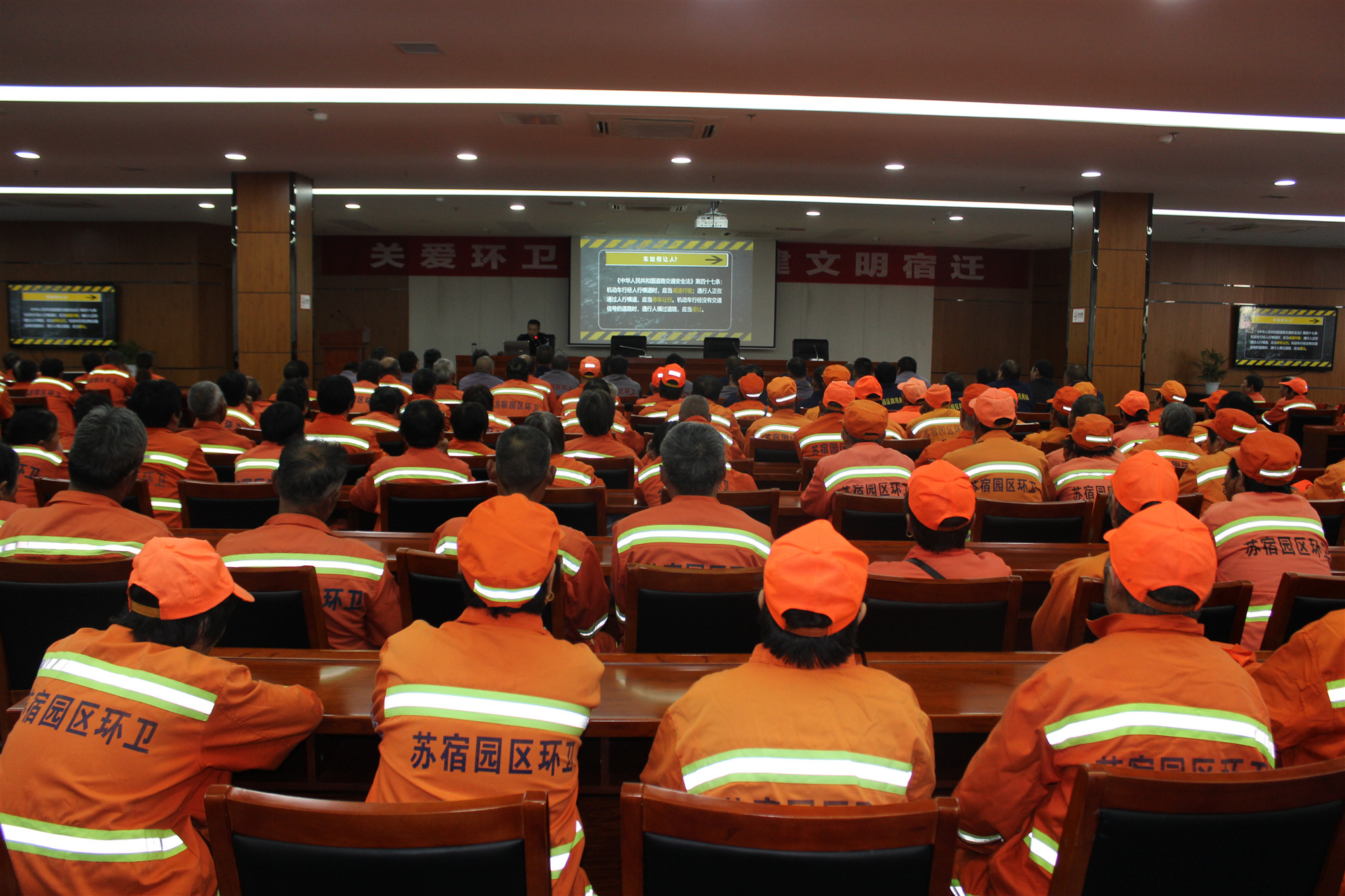 102414時(shí)30分,園區(qū)邀請市交警大隊(duì)劉強(qiáng)警官為全體環(huán)衛(wèi)工人講了一堂專項(xiàng)交通安全知識講座,通過案例和理論相結(jié)合的授課,全面提高了環(huán)衛(wèi)工人的交通安全意識。安全專題講座后,還組織所有環(huán)衛(wèi)工人觀看了愛國題材電影《周恩來萬隆之行》,增強(qiáng)了環(huán)衛(wèi)職工民族自尊心和自豪感,培養(yǎng)了他們的愛國情懷,激發(fā)他們干好環(huán)衛(wèi)工作,為建設(shè)文明宿遷添磚加瓦。