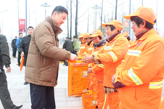 在慰問(wèn)現(xiàn)場(chǎng),許紹杰與城市維護(hù)工人親切握手,詢問(wèn)他們工作、生活情況,并送上了米、油、面等慰問(wèn)品,感謝他們一直以來(lái)為蘇宿園區(qū)城市維護(hù)工作付出的辛勤勞動(dòng),并衷心祝愿他們春節(jié)快樂(lè)、身體健康。